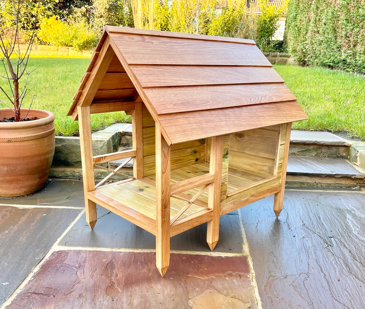 Outdoor Oak Framed Pet Chalet / Shelter Core structure & roof made from solid oak, with a treated timber tongue & groove wall & floor, and a perspex window Finished in Osmo UV Oil