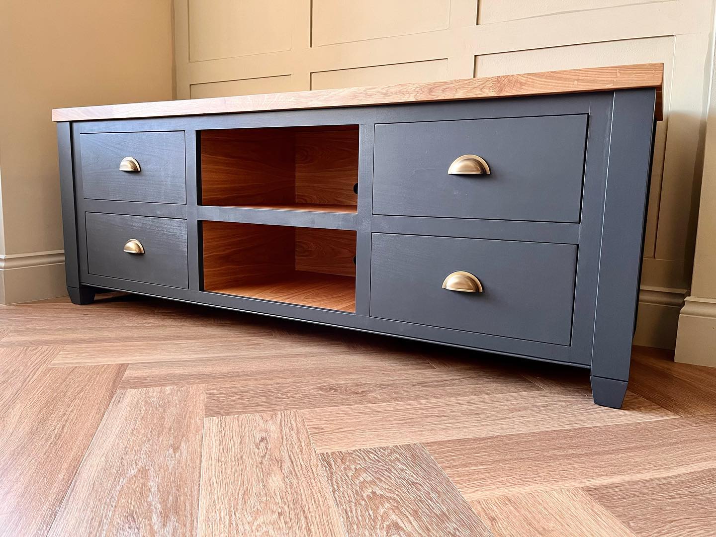 In Frame Slab style TV Table, complete with frame beading, a 40mm worktop and soft close drawers. Made from Tulipwood/Poplar Frames + Posts & Oak drawer boxes + open shelving. Painted in Farrow & Ball Off Black
