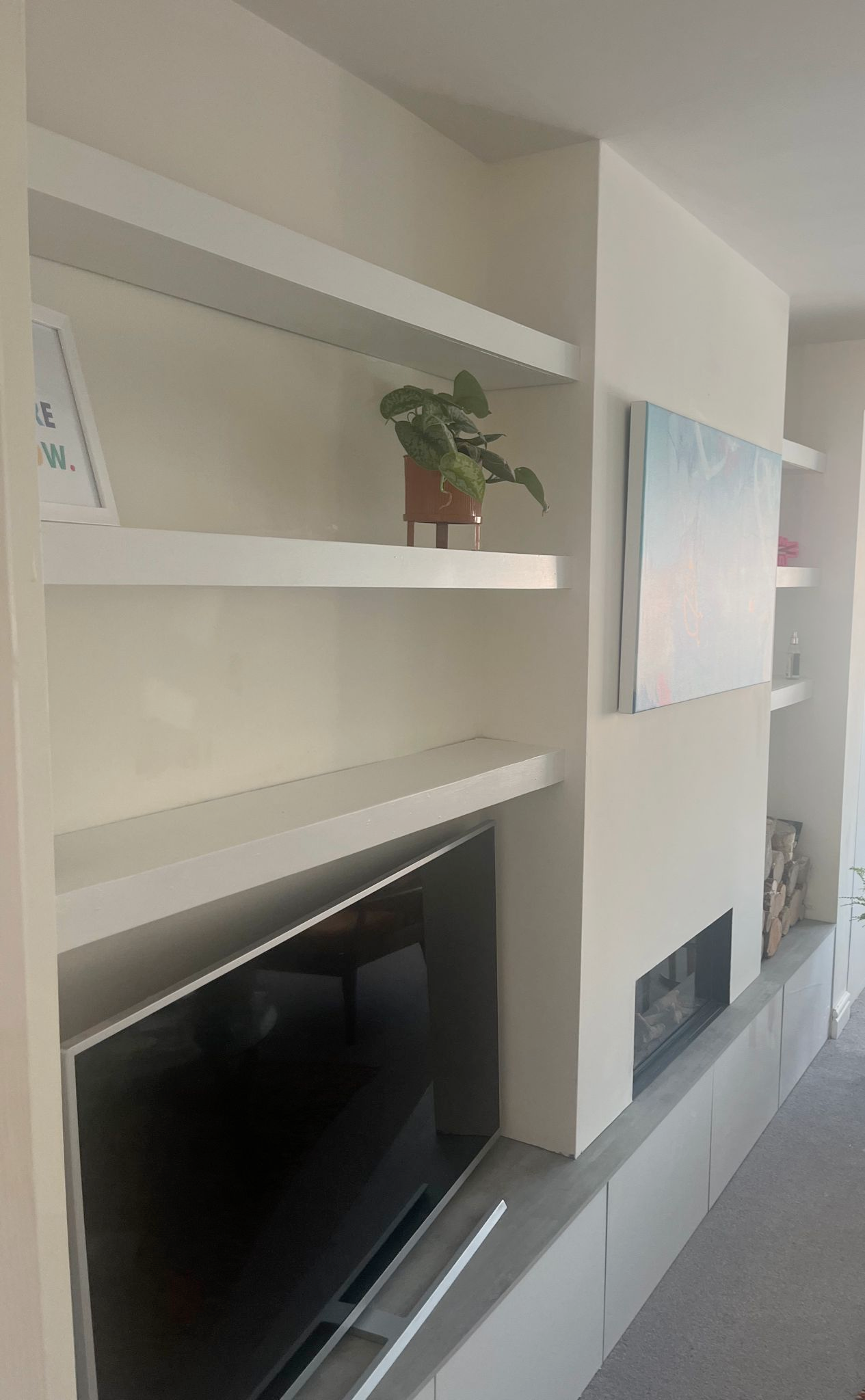 Bespoke Alcove Shelves made from a pine frame and MDF tops+bottoms+front to give a thicker look. Painted by the client in Farrow & Ball Wimborne White