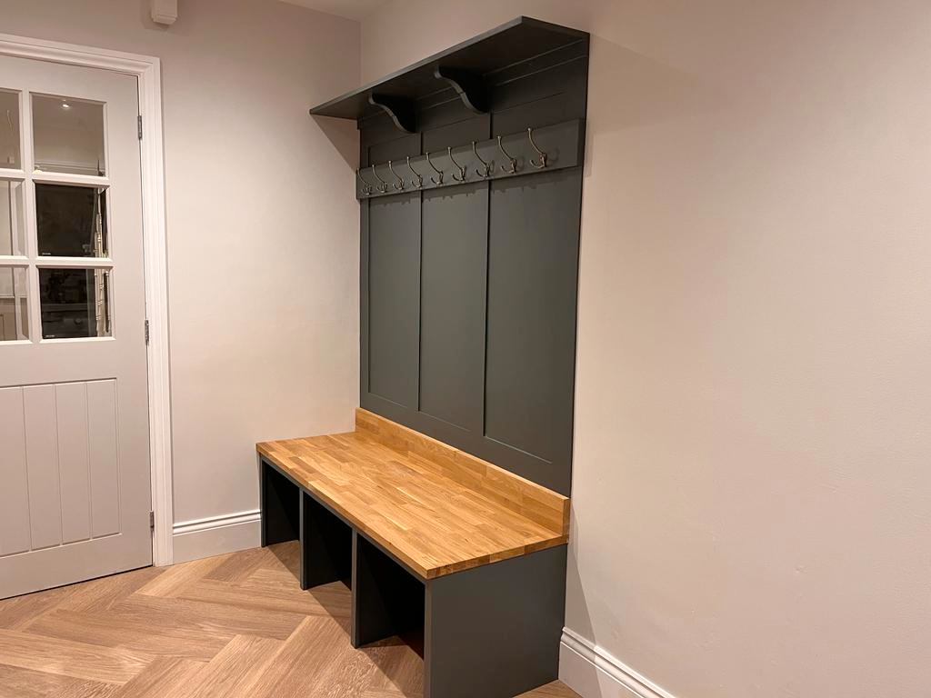 Utility Boot Room Bench with a shelf + panelled wall Painted in Farrow & Ball Downpipe